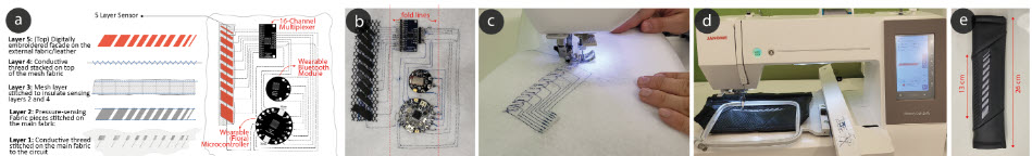 The fabrication process of the interactive seat-belt pad: a) an illustration of the 5-layer slide-sensor circuit; b) a photo of the fabricated circuit; c) machine-sewing conductive thread for Layer-1 of the sensor; d) digital-embroidery of Layer-5 on the