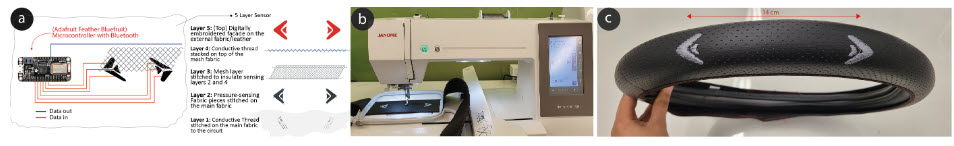 The fabrication process of the interactive steering wheel cover: a) an illustration of the circuit showing the 5-layer double-tap sensor; b) digital-embroidery of Layer-5 on the (flat) steering wheel cover; and c) the final prototype of the (rolled)