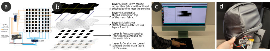 The fabrication process of the interactive headrest cover: a) an illustration of the circuit showing b) the 5-layer multi-touch sensor; c) programming the multi-touch sensing input; and d) stacking the touchpad sensor circuit (hidden) inside the headrest cover.