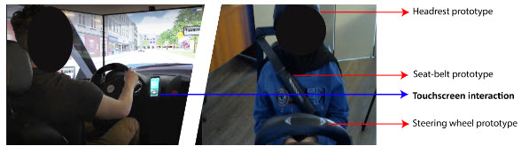 Final implemented prototypes (right) versus the touchscreen interaction through the smartphone (left) when each is situated on the driving vehicle simulator.