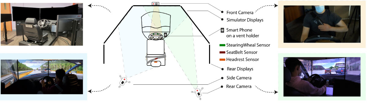 The lab setting where the vehicle simulator is situated and the three angles where the front, side and rear cameras captured participants’ interaction with the designed sensors.